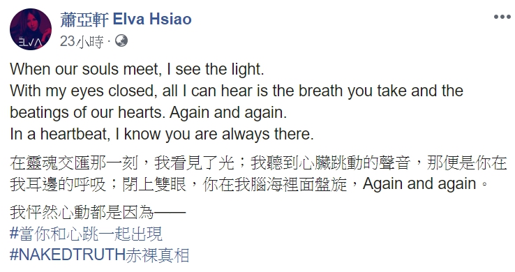 天后蕭亞軒(Elva)在40歲生日時大方認愛,對象是一位小她16歲的男友黃皓,睽違四年再次推出新專輯《NAKEDTRUTH赤裸真相》,近日事業愛情兩得意的她,也在昨日釋出第一波主打歌《當你和心跳一起出現》的MV片段,還邀請男友來擔任男主角,兩人在MV裡大方秀恩愛,閃瞎所有粉絲,讓人看了都羨慕到快瘋掉!