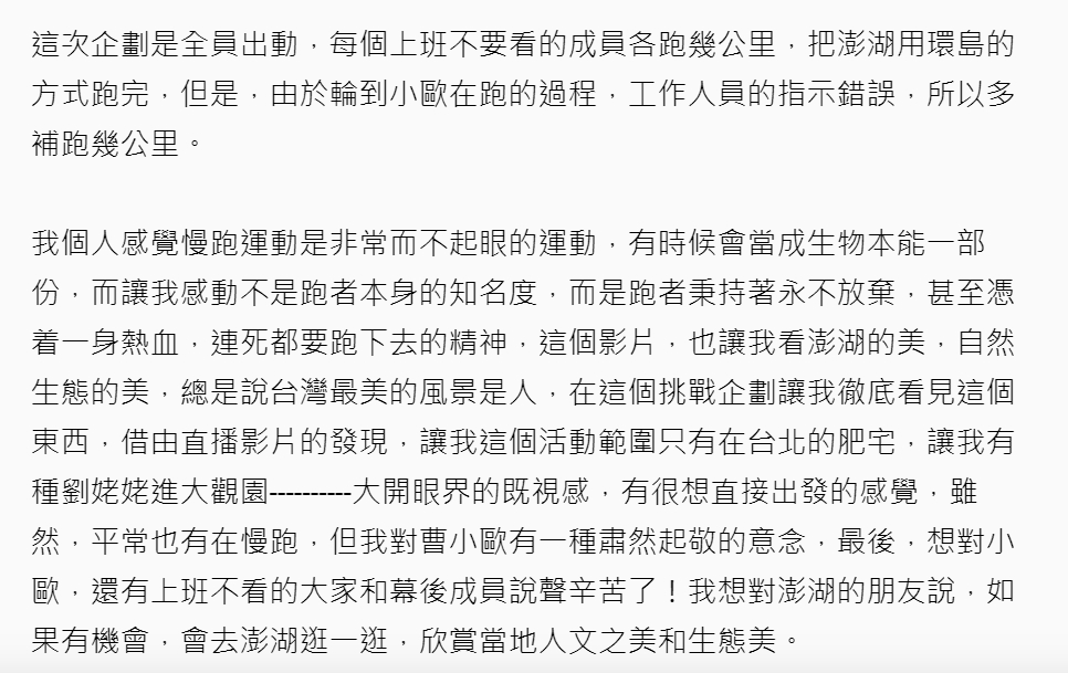 此次「上班不要看」的「澎湖環島路跑」在12日凌晨四點的時候開跑,這次跑者出動八名成員,起點和終點都是澎湖跨海大橋,一直到晚上八點結束,範圍幾乎涵蓋澎湖全島。而「上班不要看」事後也在Instagram貼出團隊大合照,並寫下「想要的是將我們一群成年人聚在一起後,還能在我們的生命中一起能完成什麼瘋狂的大事變成一個精神與象徵,只有一步一步認真的準備充足的去完成一個大活動,然後一起透過螢幕分享這個喜悅與充實感」,而他們在過程中的全程直播也讓網友大讚「有種大開眼界的既視感,有很想直接出發的感覺」,忍不住對「上班不要看」全體成員相當佩服。