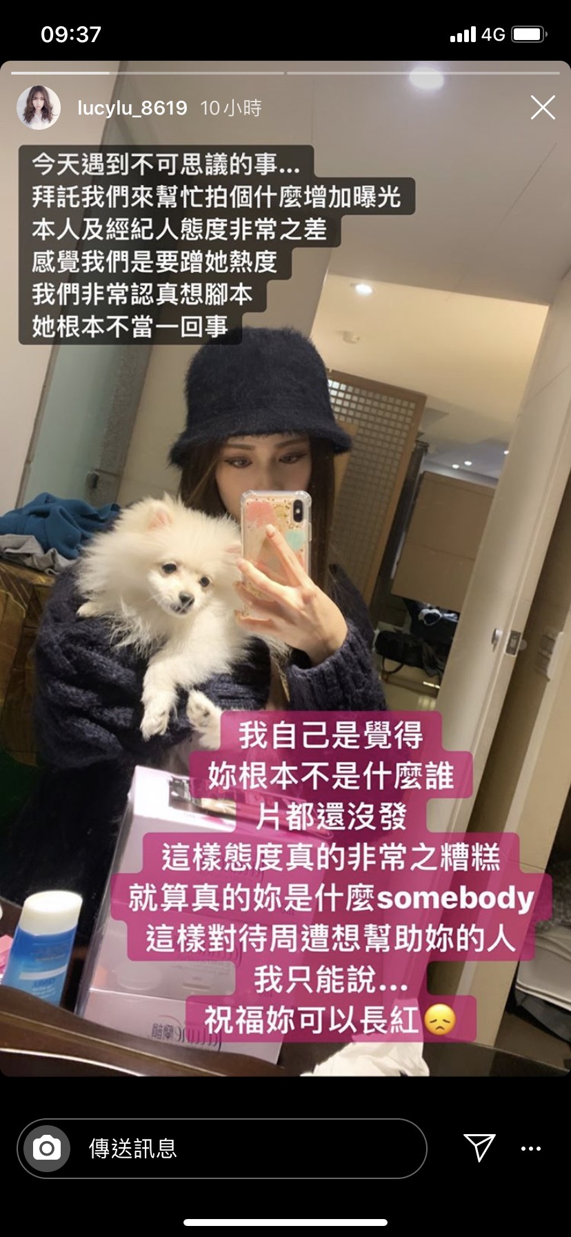 Lucy是荷蘭混血而,有著十分立體的五官,精緻的臉蛋非常吸睛,擁有不少粉絲喜愛。然而日前她卻難得動怒,在限時動態中分享「不可思議的事」!Lucy在限時動態中提到,「拜託我們來幫忙拍個什麼增加曝光,本人及經紀人態度非常之差,感覺我們是要蹭她熱度」,更透露自己認真地想腳本,卻不被當一回事!
