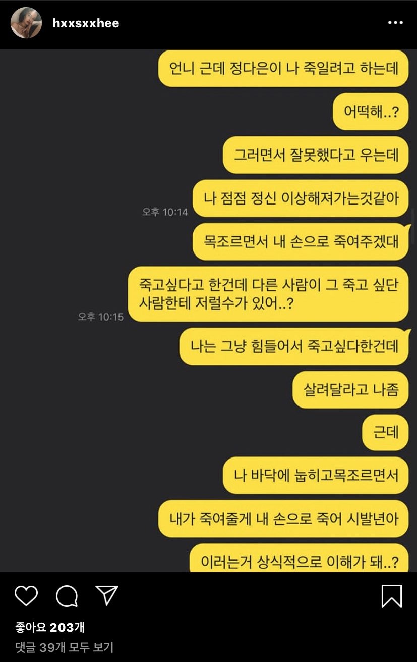 但韓瑞希昨日深夜卻被網友發現,在貼出2張對話截圖後又火速刪文,內容提到:「鄭多恩想殺了我,該怎麼辦?結果又說自己做錯了在哭,總覺得我也開始變得奇怪了…她勒緊我的脖子說『就用我的手來讓你死』,我只是因為很累才說想死的…」等內容,讓兩人瞬間登上韓網熱搜。韓瑞希同時還提到,她被鄭多恩壓在地板上掐脖子喊道:「我來殺了你吧!在我手上死掉吧!臭婊子!」,更透露是第一次在別人那裏聽到「臭婊子」三個字。