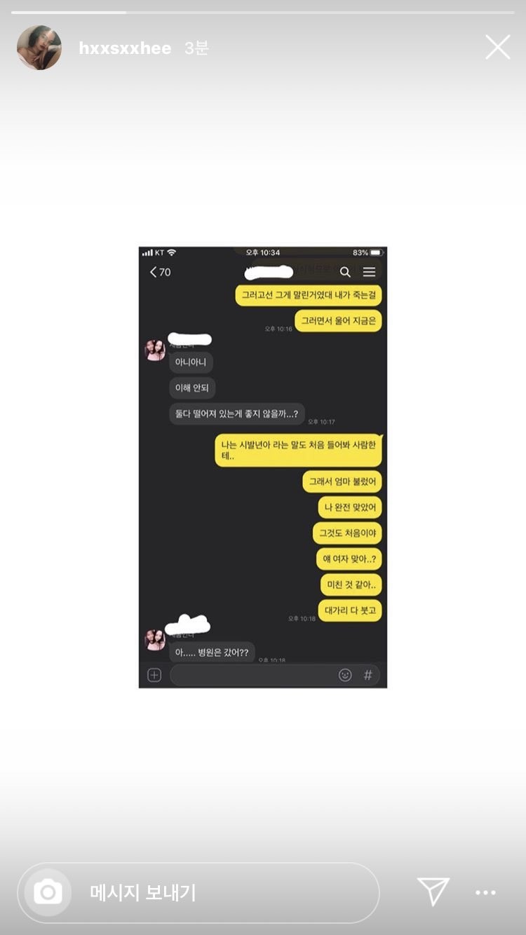 不過這兩篇貼文被韓瑞希上傳不到幾分鐘就刪除,隨後她又發布了一則新貼文,照片裡,她的手指瘀青腫脹得十分嚴重,甚至微微扭曲。如此之外,手部其它地方也有多處瘀傷,不過她要粉絲不需要擔心:「沒什麼大事,有用手保護臉所以臉沒事,只是頭和脖子有點痛而已,我很堅強的,不用擔心我。」,不過因為照片傷勢嚴重,讓韓國網友相當驚訝,也希望能夠透過網路力量讓相關單位關切此事,並維護韓瑞希的安危。