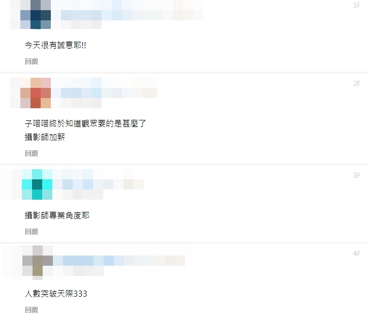 子喵喵開台結束後,有網友將直播畫面剪輯成實況精華,並分享到「遊戲大亂鬪」上,引來不少人紛紛留言表示,「今天很有誠意耶」、「子喵喵終於知道觀眾要的是甚麼了」、「攝影師專業角度」、「攝影師加一隻雞腿」。