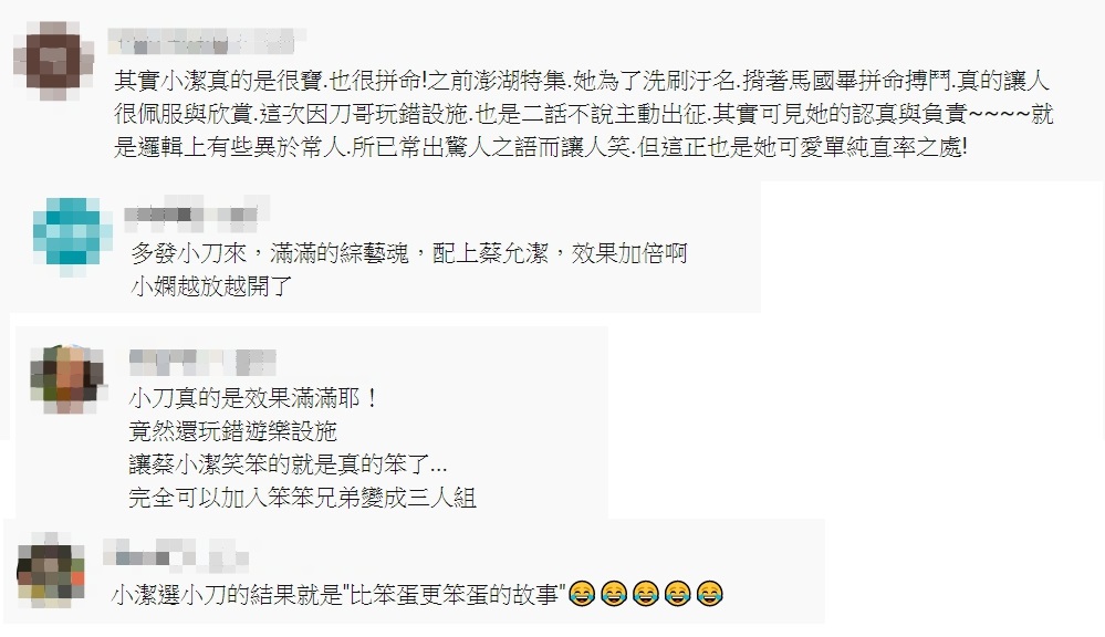 許多網友看到蔡允潔這集節目的表現,紛紛稱讚她「很拼命、很勇敢主動執行任務」,更說她「異於常人的邏輯」是個性單純直率之處,網友也瘋狂敲碗希望繼續看到兩人組合,也說非常喜歡「小刀的綜藝魂」加上「蔡允潔」之後,節目效果加倍,更笑稱兩人組合的結果是「比笨蛋更笨蛋的故事」。