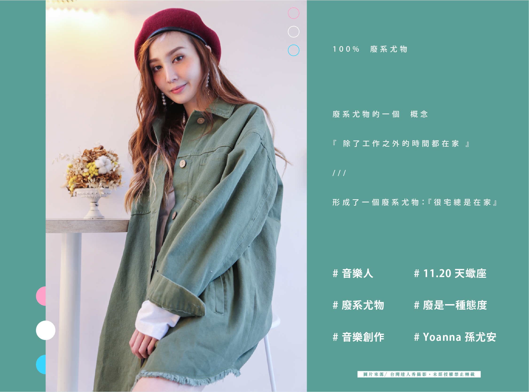 「廢系尤物」這個稱號乍聽之下可能會覺得『廢』帶有比較負面的意思,但對尤安而言恰好相反:「廢其實就是大家通俗會認知到的譬如說『整天都沒事做、不務正業、整天躺在床上玩手機』這種比較廢的事,但其實廢系尤物的一個概念是說『除了工作之外的時間都在家』,那我自己的工作內容其實也都是必須在家完成的,所以大部分的時間我其實都在家,就這樣形成了一個廢系尤物:『很宅總是在家』」。