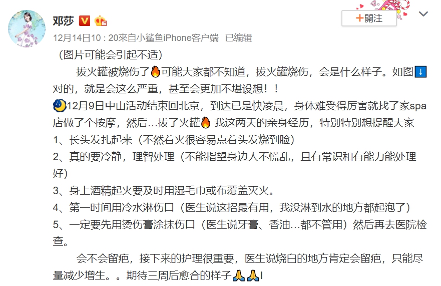 鄧莎同時在貼文裡教大家拔火罐要如何預防意外,以及萬一燒燙傷後如何及時處治,她表示拔火罐時長髮一定要扎起來,不然頭髮容易著火;萬一身上起火,要及時用濕毛巾或濕布覆蓋滅火,第一時間要用冷水淋傷口,她透露自己「醫生說這招最有用,我沒淋到水的地方都起泡了」,並且呼籲大家要用正確的藥膏處理傷口,一般坊間流傳的牙膏、香油等偏方其實並沒有用。鄧莎也透露自己的傷口肯定會留下疤痕,癒合的週期起碼需要三週。