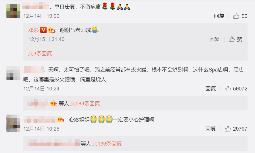 鄧莎的傷勢引起網友熱議,「鄧莎拔火罐被燒傷」的話題也衝上微博熱搜。網友也紛紛留言「早日康復,不留疤痕」、「心疼姐姐,一定要小心護理啊」、「看著心疼啊好好恢復」,也有網友心疼痛批「天啊,太可怕了吧,我之前經常都有拔火罐,根本不會燒到啊,這什麼Spa店啊,黑店吧,這哪裡是拔火罐哦,簡直是燒人」。