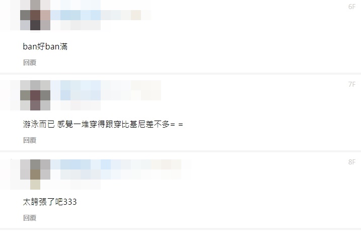 子喵喵被Ban消息一出,立刻有人幫忙打抱不平表示,「真的很愛ban人欸」、「太誇張了吧」、「其他人都沒事就台灣的有事」、「游泳而已,感覺一堆穿得跟穿比基尼差不多= =」。