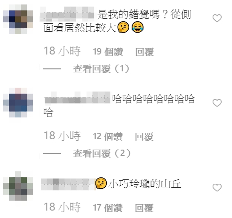 兩人的胸部對比也引起網友熱議,紛紛留言「是我的錯覺嗎?從側面看居然比較大」、「小巧玲瓏的山丘」、「和開水比是怎樣啦XDDD」、「痴痴最大」、「哈哈哈哈哈哈哈哈哈」、「看來最近常健身哦,胸肌都『微微』的顯現出來了」、「這樣你就不會擋住旁邊的玉山了」、「痴痴不要難過」。