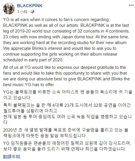對於粉絲們的訴求,YG娛樂在BLACKPINK官方臉書上做出回應,表示BLACKPINK將在2020年推出全新專輯,YG娛樂表示全公司在此向廣大歌迷致上最深切的謝意,並藉此機會與大家分享公司正在盡最大努力為BLACKPINK和Blinks提供最好的音樂作品。
