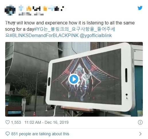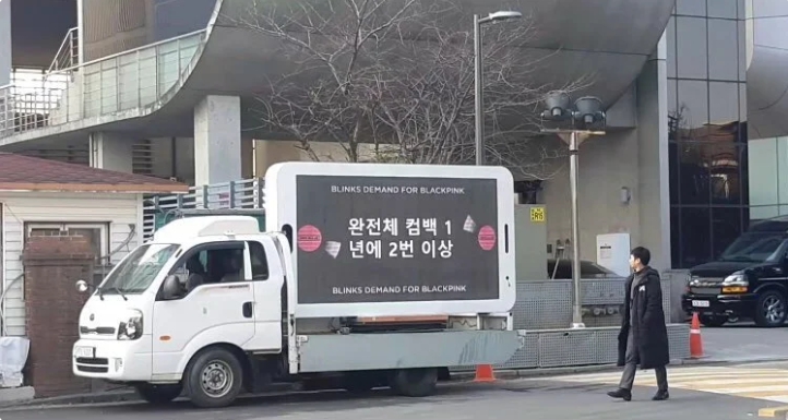 為了表達訴求,BLINKS自掏腰包在YG娛樂公司門口設置廣告卡車,讓一邊車子在首爾市區漫遊,一邊播放BLACKPINK的音樂影片,同時暗示BLACKPINK推出的作品不多,引發網路上熱烈討論。廣告卡車的價錢沒有公開,但據網友評估費用至少價值千萬美元。
