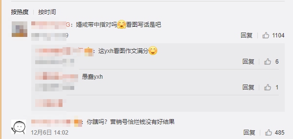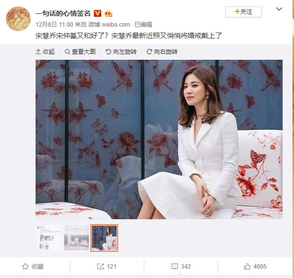 近期,有眼尖的網友發現,宋慧喬在出席活動時,手上戴起了戒指,讓他忍不住表示:「宋仲基和宋慧喬又和好了?宋慧喬最新近照又悄悄將婚戒戴上了」,懷疑兩人復合有望。不過該營銷號才剛發文,立刻被網友罵翻:「婚戒帶中指對嗎?看圖寫話是吧」、「看圖作文滿分」、「你瞎嗎?行銷號恰爛錢沒有好結果」。