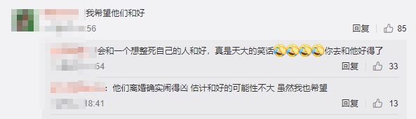 不過也有兩人的死忠粉表示:「我希望他們和好」,但普遍網友也認為機率不大,推測當時兩人離婚鬧得太兇,透露:「會和一個想整死自己的人和好,真是天大的笑話」、「他們離婚確實鬧得凶 估計和好的可能性不大 雖然我也希望」。事實上,網友會有這樣的希望也非空穴來風,因為當時兩人愛得轟轟烈烈,離婚後宋慧喬也被爆出偷看宋仲基限時動態的傳聞,讓許多cp粉仍對兩人復合抱有一絲希望。