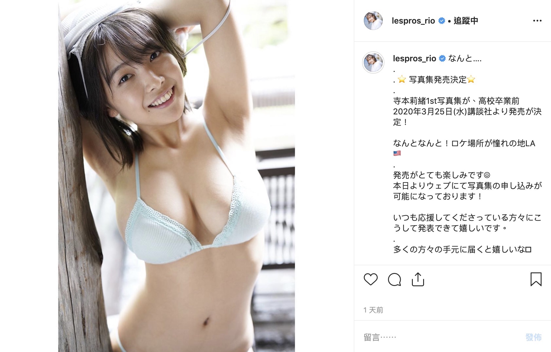 寺本莉緒在昨日發文宣布即將明年3月25號發行「高校卒業前」的寫真集,也在文中感謝一路以來支持的粉絲,除了宣布寫真集發行的時間之外,寺本莉緒也曬出一張僅穿著內衣的性感照,畫面中她身穿一件淺藍色的內衣,雙手高舉至頭上,手上還有著脫下的衣服,姿勢相當性感撩人,寺本莉緒面對鏡頭更露出甜美的微笑,令粉絲們紛紛直呼:「太可愛了」、「絕對會買」、「太美了」。