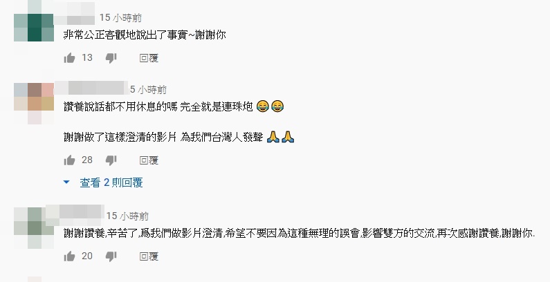 影片一出,立刻引來不少網友支持,紛紛留言表示,「非常公正客觀地說出了事實~謝謝你」、「謝謝讚養,辛苦了,爲我們做影片澄清,希望不要因為這種無理的誤會,影響雙方的交流,再次感謝讚養」、「看到韓國人說他是國民mc的時候真的吐了一口血,給他這個封號的有問過我們的意見嗎?」。