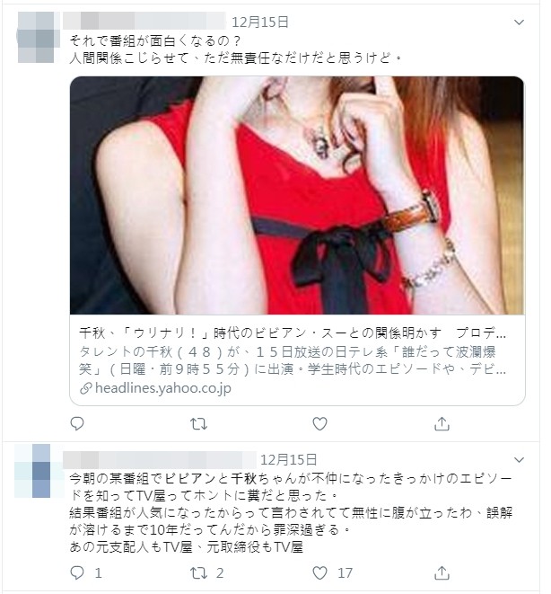 根據《Sponichi Annex》報導,當年千秋跟《火焰大對抗》的主持人內村光良、諧星宇藤鈴木一起組成「口袋餅乾」,在節目中擁有了高人氣,甚至推出的單曲還整個大賣!跟徐若瑄的「黑色餅乾」也一起登上紅白歌唱大賽,在當年這兩個團體可以說是人氣超火紅啊!沒想到,當年千秋跟徐若瑄的友誼關係,卻在某次偶然得知消息「徐若瑄因不喜歡千秋還常被邀約,累積壓力很困擾,開心的只有千秋一個人」。讓千秋相當受傷,從此除非因工作同台,不然她絕對跟徐若瑄私下不會再見面,兩人的關係也就漸行漸遠......。