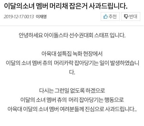 16日時,《偶像運動會》進行春節的錄製,除了眾多偶像藝人到場之外,不少粉絲也在場邊為「本命」加油,因此現場人滿為患。不過卻有眼尖的粉絲發現,有一名男性工作人員,在叫Chuu接受採訪時,居然不是拍肩膀,而是直接拉對方的頭髮,而該名網友也將這段影片放上推特,引起大量網友不滿,造成一陣熱議!