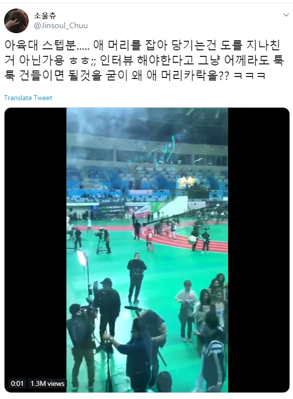 影片中,一群女偶像們原本在場邊聚在一起聊天,結果訪問區的一名男性工作人員,慢慢地走到Chuu身後,然後用手拉對方的頭髮,把Chuu帶到訪問區。該名網友上傳影片後,氣炸表示:「直接拉別人的頭髮太過分了吧?明明只要拍拍對方肩膀就可以了」。