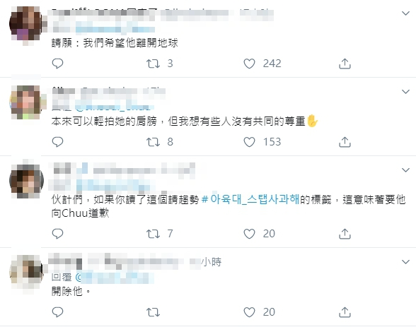 而影片曝光,也引來許多網友附和,紛紛表示:「本來可以輕拍她的肩膀,但我想有些人沒有共同的尊重」、「開除他」,更在留言公開了該名男工作人員的正面長相,撻伐該名工作人員,還發起「#偶運會_工作人員道歉」。隨後,電視台MBC也發出道歉聲明,表示「至上深深歉意」,不過大批網友仍不買帳。