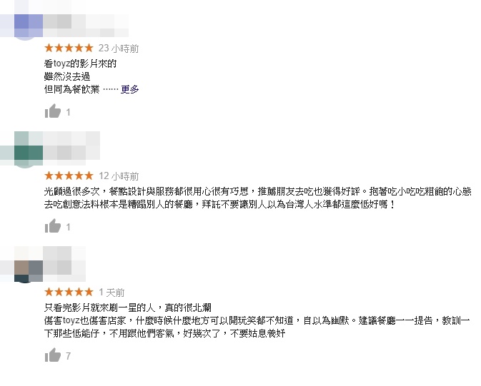 Toyz影片一出,即便他已呼籲別亂刷評價,但仍有不少人開刷,讓該店家近日出現非常多1星評價,從中可以看到評論「難吃,踢歐歪利都說了真的難吃」、「toyz 說難吃,那沒辦法」。另外,也有許多人幫忙刷5星補血,瞬間在google評論吵成一片。