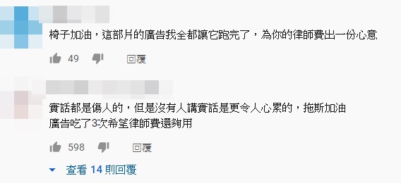 而Toyz影片下方也引來不少人留言,紛紛發表看法提到,「美食公道伯,法院我最熟」、「究竟法院系列何時開拍」、「椅子加油,這部片的廣告我全都讓它跑完了,為你的律師費出一份心意」、「真心建議,組個律師團⋯」。