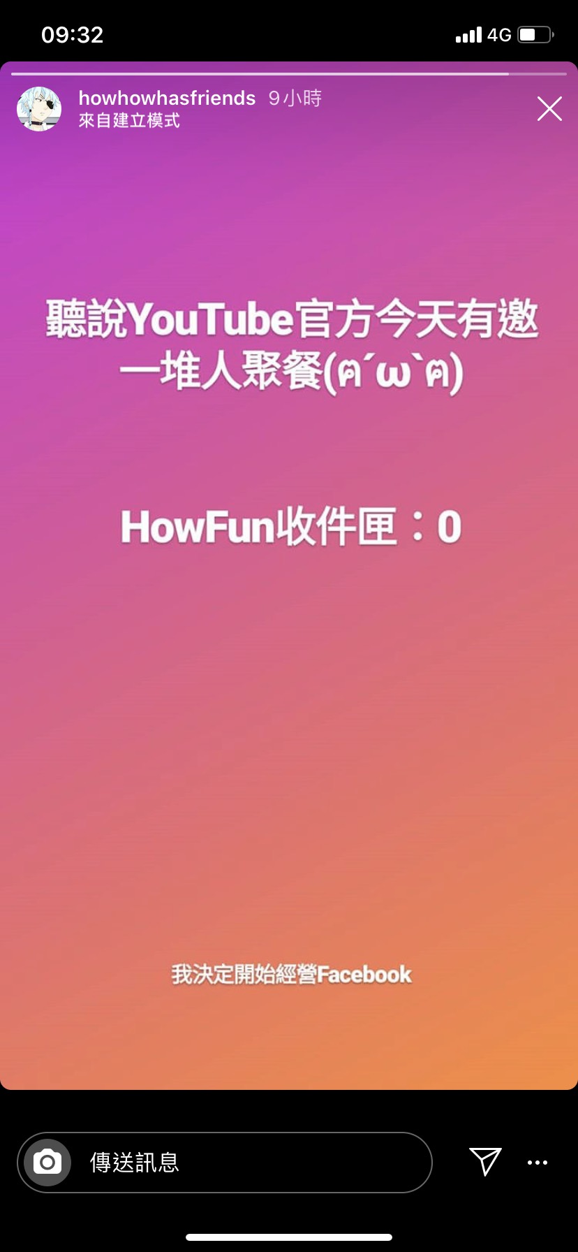 17日上午HowHow在Instagram更新限時動態,他表示「聽說今天YouTube官方今天有邀一堆人聚餐」,接著幽默寫下「Howfun收件匣:0」,意旨信箱沒有收到任何邀請,也因此讓HowHow開玩笑表示:「我決定開始經營Facebook」。