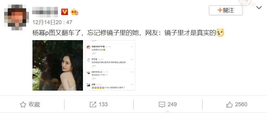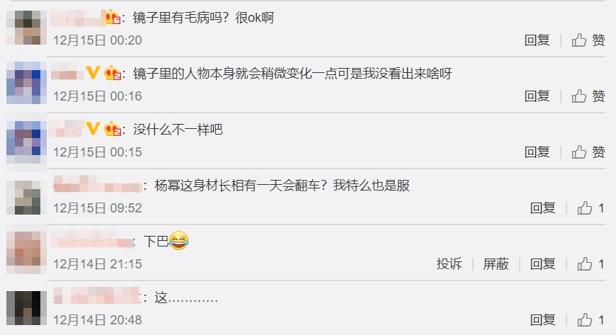 楊冪的鏡子倒影和她本人身形的巨大對比引起網友熱烈討論,有網友不禁表示「是不是P圖又翻車」、「鏡子裡才是真實的」、「她的p圖終於翻車了,不翻車的都不是她的真實狀態,翻車的才是」,但同時也有網友反駁「鏡子裡有毛病嗎?很ok啊」、「鏡子裡的人物本身就會稍微變化一點可是我沒看出來啥呀,沒什麼不一樣吧」、「楊冪這身材長相有一天會翻車?我特麼也是服」、「就是很好看啊,無語。」