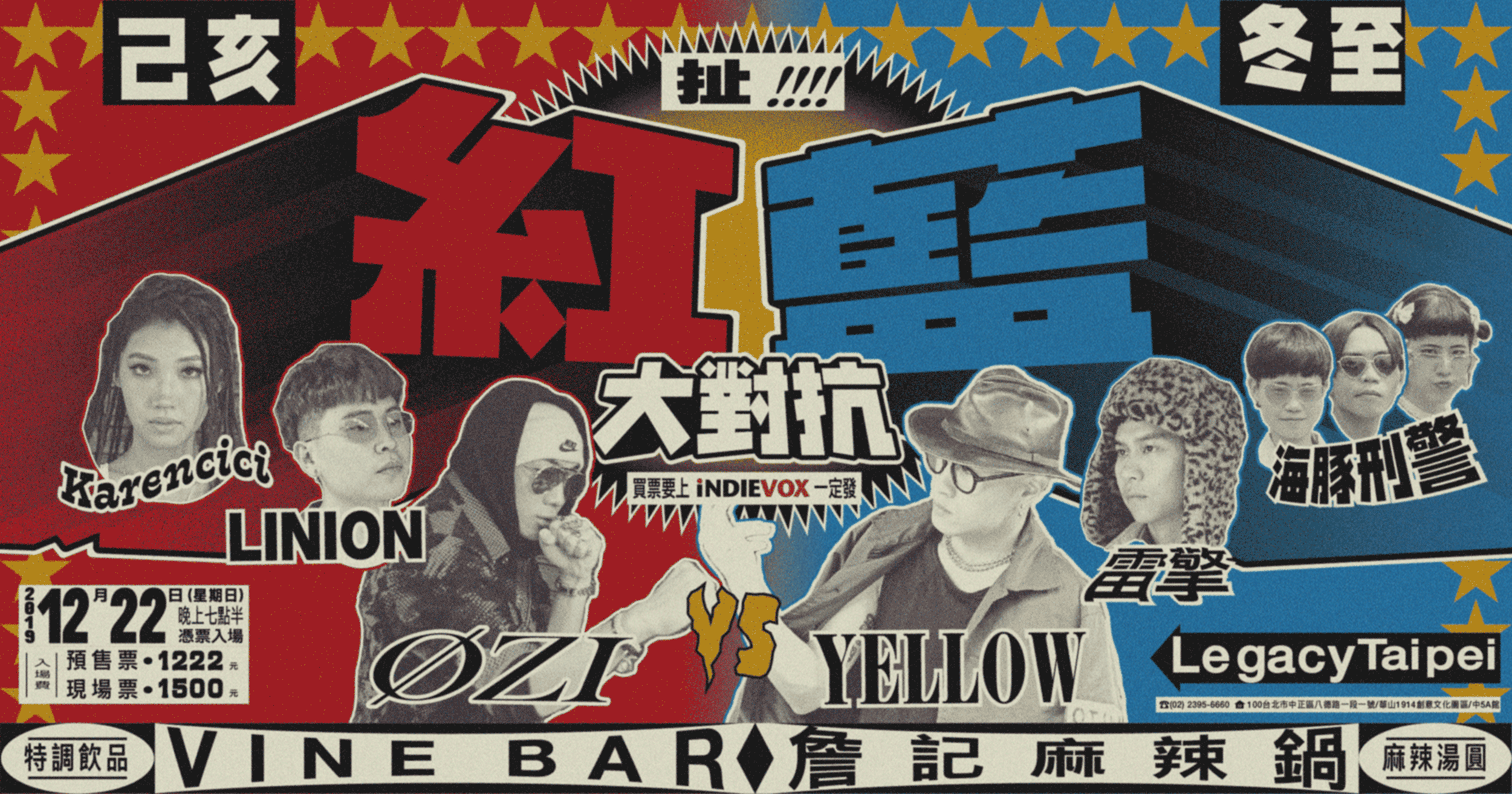 本年度最扯的「扯!!!!己亥冬至紅藍大對抗」演唱會將於12/22(日)冬至夜於LEGACY 台北登場,這場演唱會將打破外界拼盤演出定義,上演絕無僅有的全武行大亂鬥,網羅最狂金獎系列歌手助陣,包括金曲獎得主ØZI、YELLOW個別領軍,號召金音獎得主Karencici、LINION、雷擎、海豚刑警組隊,打造史上最夢幻PK陣容。