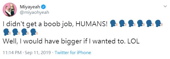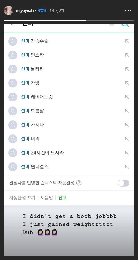 對此,宣美感到非常無奈,特地在社群網站上PO出搜索結果,解釋自己並沒有動隆乳手術,「只是變胖了!」,而她的粉絲們也紛紛安慰,表示她的胸部一直都很「雄偉」。事實上,宣美近年來為了更好的體態,一直不斷積極地進行增重,近期已經到了50公斤,沒想到卻爆出了烏龍新聞。