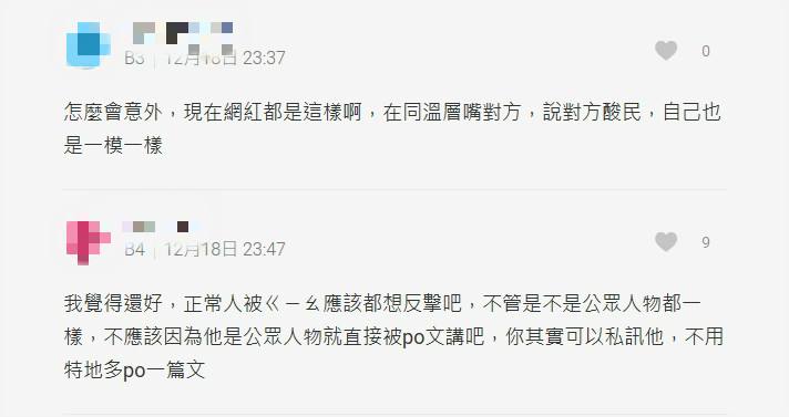 此事件掀起網友瘋狂討論,不同的聲音接連浮出台面,有網友表示「我覺得影片中的字眼還好」,也有人表示因為被攻擊在先,想要做出反擊是正常的,同時也有人表示「現在網紅都是這樣啊,在同溫層嘴對方,說對方酸民,自己也是一模一樣」,網友的言論各有立場。