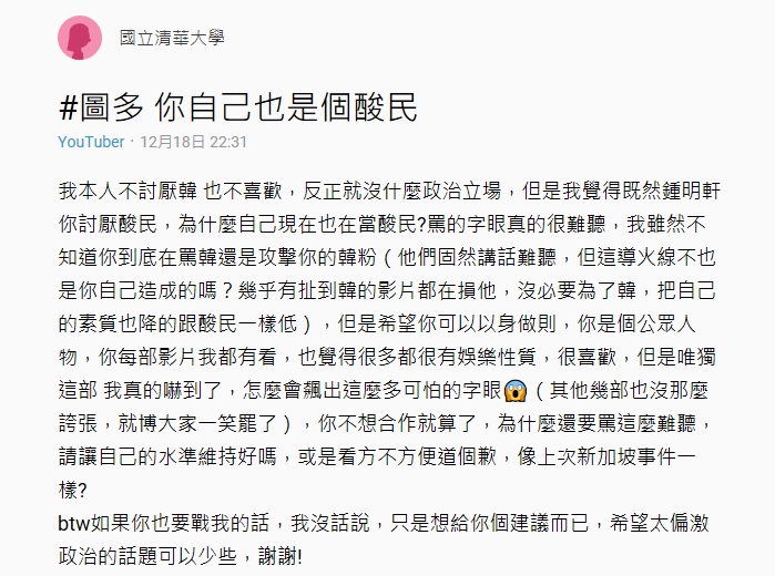 日前鍾明軒上傳新影片「今天要當女生」,內容中他表示因在網路上政治立場太明顯,引來韓粉們私訊攻擊「鍾明軒不男不女」、「人妖」等激烈字眼。剛好鍾明軒又收到韓國瑜辦公室的邀約,讓鍾明軒強烈拒絕合作,同鍾明軒也秉持「有話直說」的風格,講了不少韓國瑜的缺點,十分地嗆辣敢言。