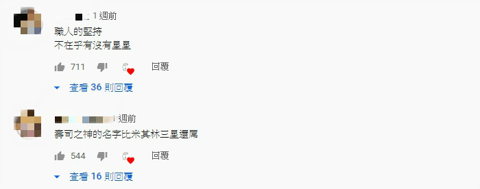 據網友在影片底下的留言,可見眾多網友們並不在意這三顆星,想去的人還是會去吃:「職人的堅持,不在乎有沒有星星」、「有機會去日本吃看看」、「被拔三星又怎樣?真正好吃的東西還是會有人去吃的」,更有網友逗趣回應,「我還是乖乖的去吃爭鮮。」