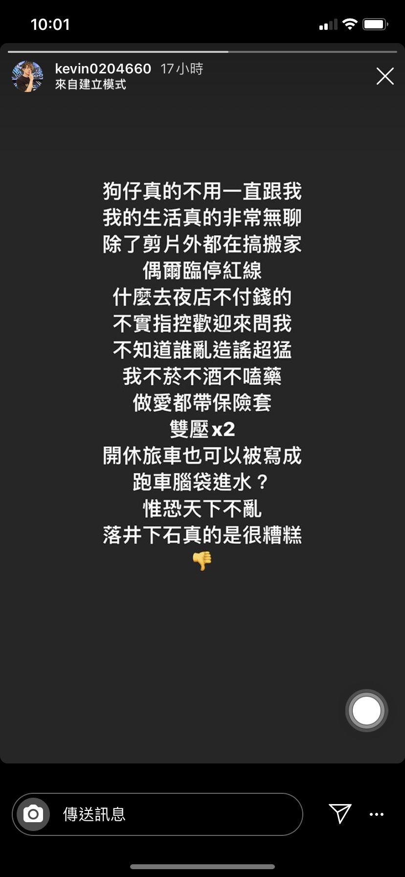 酷炫在昨(19)晚更新限時動態,只見全黑背景配上一大串文字,其中他表示「狗仔真的不用一直跟我,我的生活真的非常無聊,除了剪片外都在搞搬家」,另外他也透露,關於「夜店不付錢」是不實指控,並提到自己不菸、不酒、不嗑藥的優良表現,呼籲大家別落井下石。