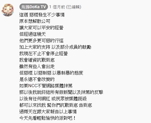 知名Youtuber「烏鴉Doka」頻道目前擁有73萬訂閱,自稱「流言終結者」,過去以拍攝都市傳說、一番賞、中獎機率實測影片走紅,擁有不少死忠粉絲。前陣子烏鴉大動作踢爆「媒體真相」,直言會抗戰到底!沒想到日前有網友發現,烏鴉有一個月沒發影片,因此十分擔心烏鴉安危,對此「惡棍娛樂」也做出回應!