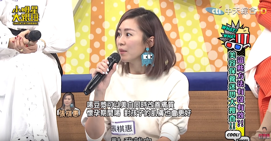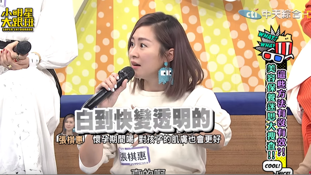 最近張棋惠在《小明星大跟班》節目中大方分享自己的保養祕訣,她表示在懷孕期間狂喝豆漿再加上珍珠粉,不僅媽媽自己可以美白,連帶著肚子中小孩的肌膚也會變好,她說得頭頭是道且態度堅定,分享女兒出生後真的「白到快變透明」,如此誇張的言論,讓現場來賓紛紛笑說,「你可不可以不要在節目上說謊」。