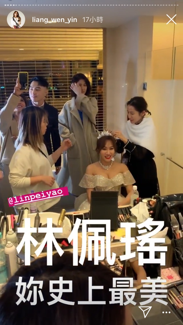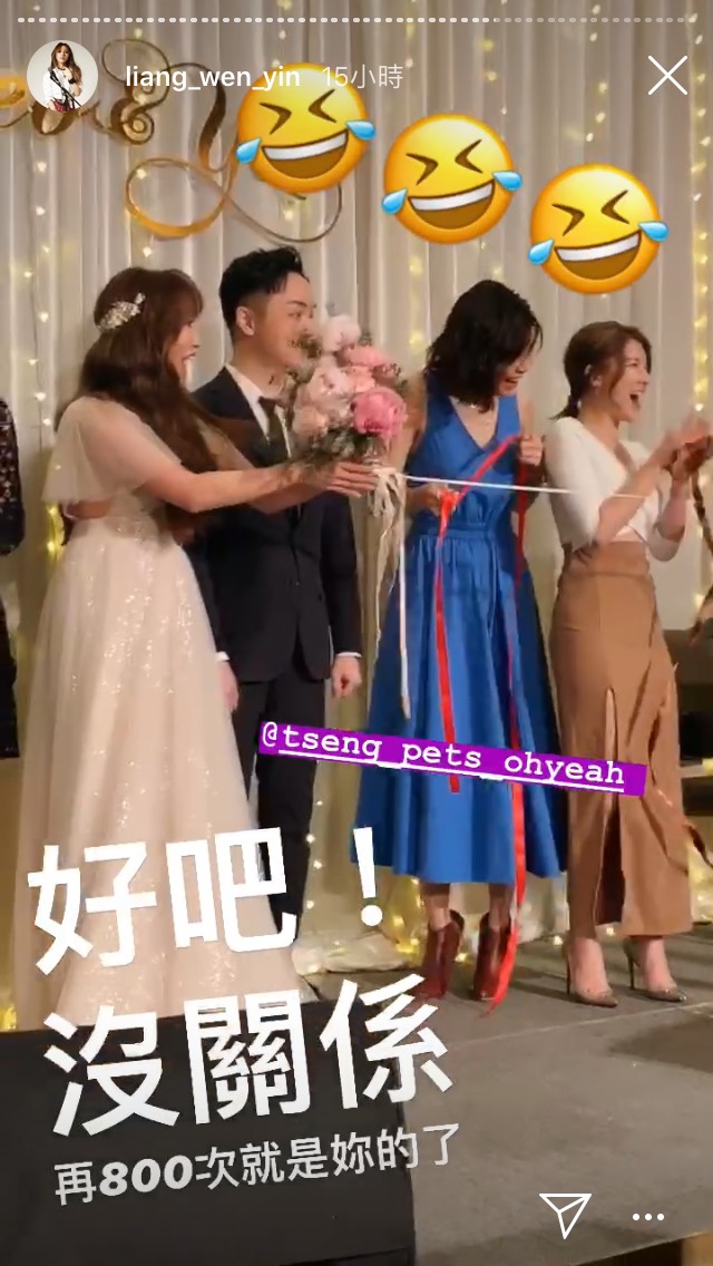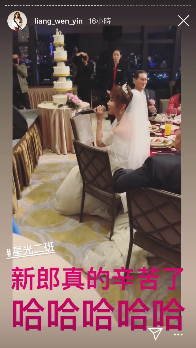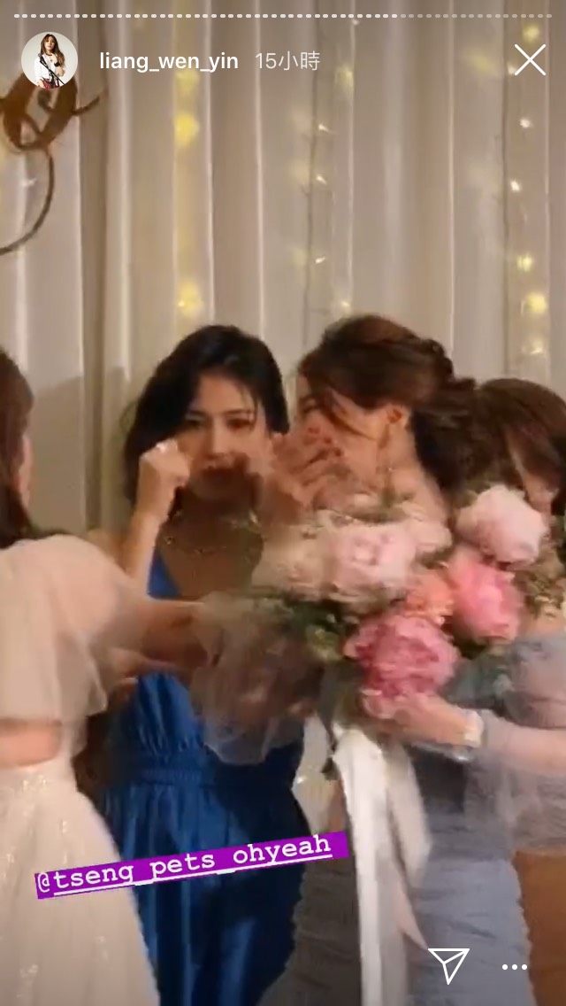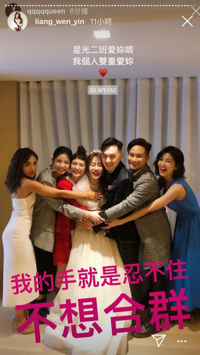 這次林佩瑤的婚禮來了許多星光二班的戰友,大家都為她出嫁感到非常興奮,也紛紛在IG上分享喜悅,像是魏如昀就在大合照中寫下,「我個人雙重愛妳!」而梁文音則是分享魏如昀的照片並且寫下「我的手就是忍不住不想合群!」,故意把林佩瑤的雙球給遮住,讓人看了忍不住想笑~在婚宴結束後,眾人還續攤去KTV歡唱,林佩瑤跟老公也有對唱「妳最珍貴」,讓人看了都忍不住羨慕不已。