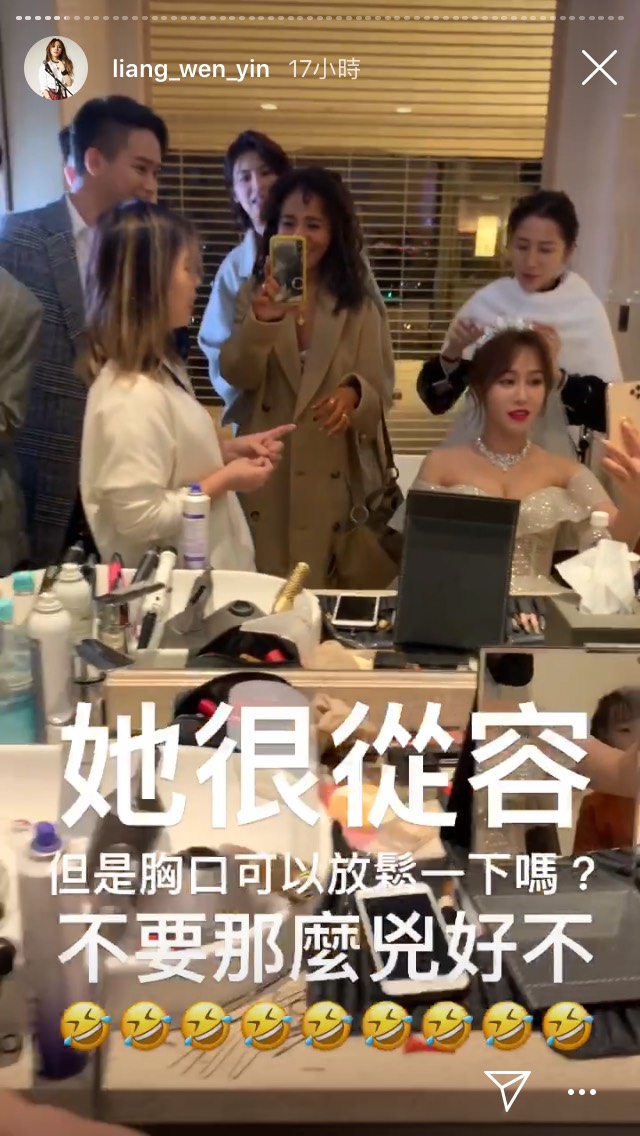 之前林佩瑤已經在社群平台上瘋狂曝光許多婚紗照,讓網友們都可以大飽眼福,沒想到婚禮當天的禮服則是走典雅公主風,讓她可以大露白皙半球!而這次參加婚禮的星光二班戰友,包含了曾沛慈、李千那、梁文音、魏如昀...等人,大家在一大早就突襲了新娘房還在網路上PO出影片,我們可以看到林佩瑤正在梳化打扮,大家也都紛紛直呼,「林佩瑤好美!」還調侃她說,「妳的胸部比臉大欸!」就連梁文音也忍不住開玩笑說,「她很從容,但是胸口可以放鬆一下嗎?不要那麼兇好不!」
