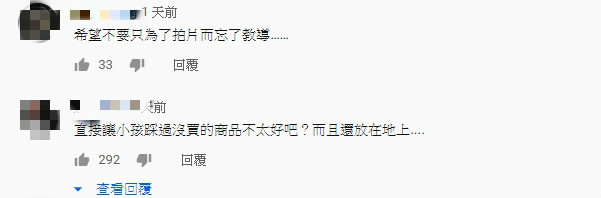 影片一上傳後便引發網友熱烈討論,大多數人都表示這樣將尚未結帳的玩具放在地板上挑選不太好,同時被小孩踩到的玩具還放回去更是不恰當,網友紛紛留言表示,「覺得玩具放地上踩過去不太好」、「直接讓小孩踩過沒買的商品不太好吧?而且還放在地上……」,也有網友直接呼籲,「希望不要只為了拍片而忘了教導。」