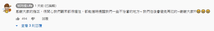 引發網友一陣熱議後,蔡阿嘎除了出面在影片評論下說道:「感謝大家的指正,很開心我們觀眾都很理性,都能適時提醒我們一些不恰當的地方~我們往後會避免再犯的~謝謝大家」,更在IG轉發一位網友在Dcard上針對這個事件的貼文,表示他們都有看見,並再次發文致歉,「謝謝大家的指正」。