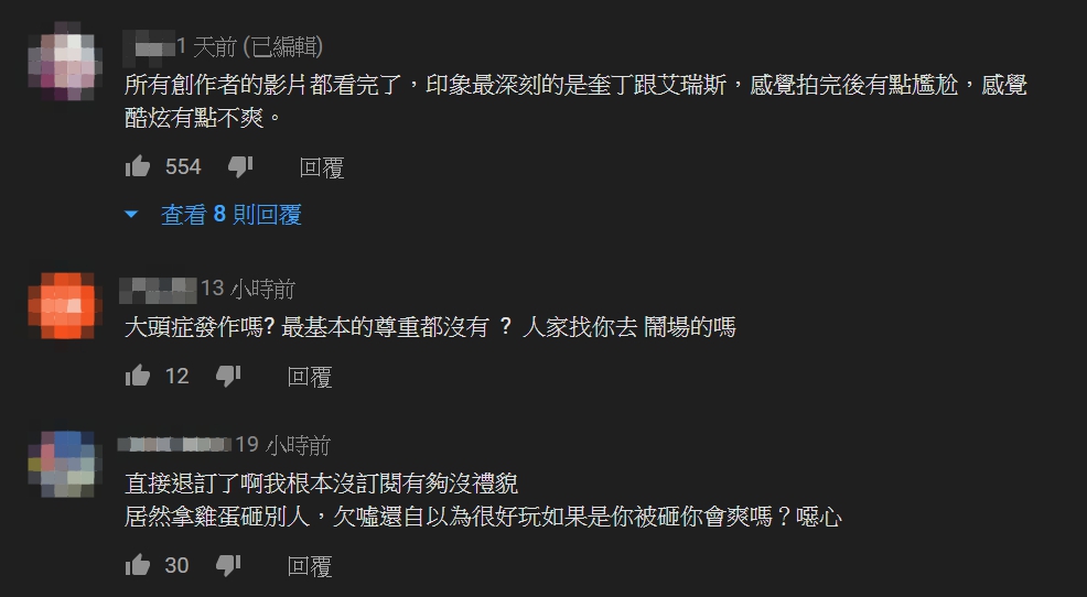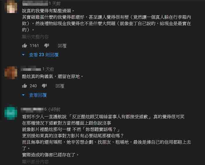 奎丁也把交換禮物影片PO到YouTube頻道,然而過程中的不當舉動卻遭網友怒氣洗版,紛紛表示「這並不是交換禮物,感覺像惡整,艾瑞絲脾氣也太好了」、「大頭症發作嗎?最基本的尊重都沒有?人家找你去鬧場的嗎」、「直接退訂了啊我根本沒訂閱有夠沒禮貌,居然拿雞蛋砸別人,欠噓還自以為很好玩如果是你被砸你會爽嗎?噁心」、「純路人看了都覺得沒禮貌,就是小學生那種無聊當有趣,還要講成自己好有創意,人家沒生氣是給你面子,還在那邊沾沾自喜」。據悉該場地是酷炫朋友的攝影棚,奎丁開玩笑問酷炫「你會生氣嗎?」時,酷炫則回道「妳要聽實話嗎?」雖然沒有特別明顯的情緒,但也讓網友指出酷炫其實有點「不爽」。