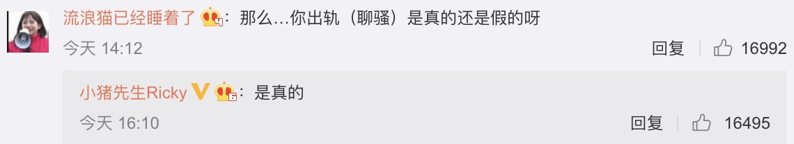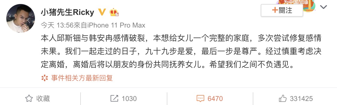 今年6月時小豬就曾被韓安冉指控出軌一名網紅「陳妮妮」,更在直播中透露小豬婚後一直沒有改變,兩人婚姻也走到盡頭,當時男方也公開發文致歉,對此也有網友在留言中提問「那麼...你出軌(聊騷)是真的還假的呀」,而他也證實是真的。