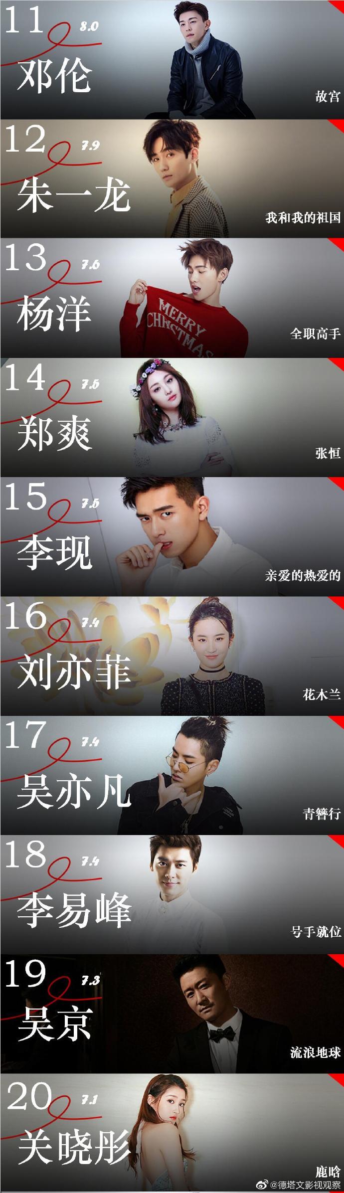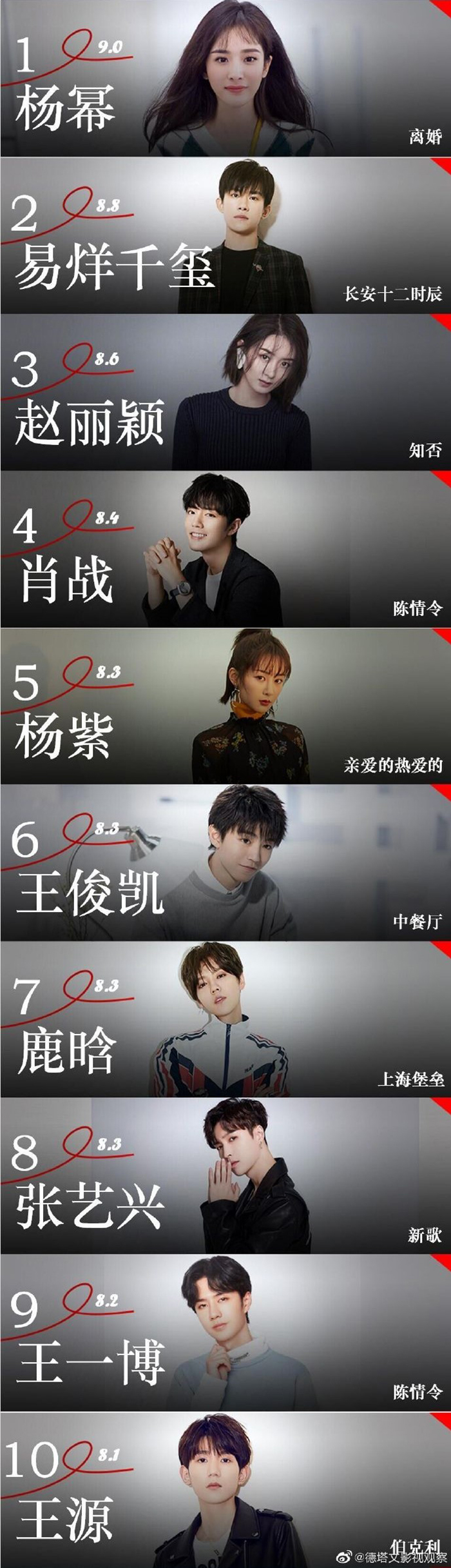 「德塔文影視觀察」根據過去一年藝人的網絡搜尋影響力、媒體影響力、微博影響力、微信影響力、貼吧(討論區)活躍度和各個範疇的均衡程度等各個媒體指數得出總分。大陸偶像團體TFBOYS中的易烊千璽今年活躍於綜藝、電影、電視劇三棲,《少年的你》以及《長安十二時辰》等皆表現不俗,而王源宣布到歐陽娜娜的學校「柏克利音樂學院」進修,也造成網路熱門話題,王俊凱則憑藉熱門綜藝《中餐廳》上位榜單;而今年陸劇暑期檔由於兩大劇《親愛的,熱愛的》以及《陳情令》熱播,讓楊紫、肖戰、王一博以及李現躋身榜單。