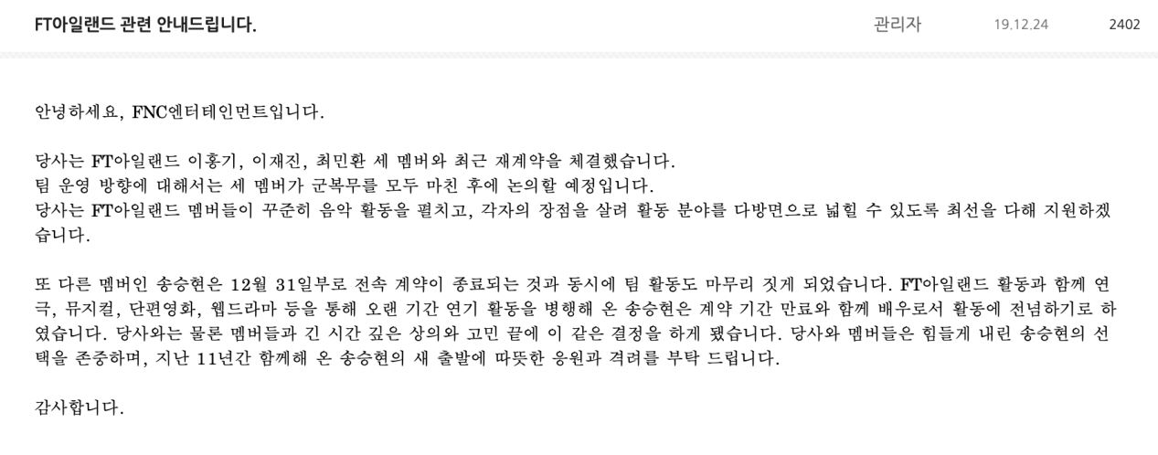 今日,經紀公司FNC娛樂發表聲明,表示隨著合約到期,近期已經和FTISLAND的成員李洪基、李在真、崔敏煥等人完成續約,不過由於宋承炫對於未來的規劃不同,想專注於演員活動上,所以今年底合約到期後,便不再續約。