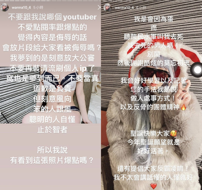 美麗妄娜、奎丁紛紛於社群平台道歉,同時奎丁也曬出與各youtuber的私訊對話,證實自己曾一一私訊致歉過,然而風波未就此平靜。美麗妄娜突在IG連發限時動態,其中她表示,「從前有個人說願意原諒甲,卻到處在背地裡說不是,甲再次道歉,那個人卻發文公審,導致甲最後被眾人唾棄到死。」意有所指,似乎透露出自己的委屈。