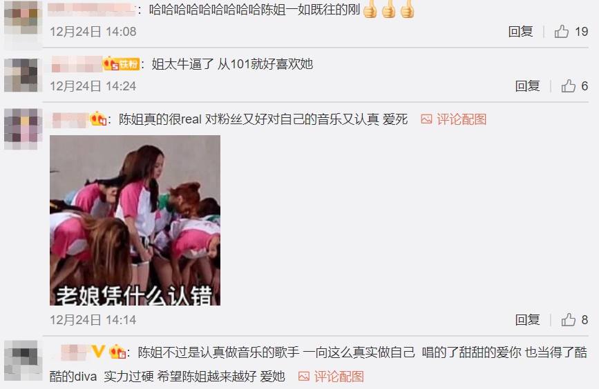 陳芳語終於為自己發聲的舉動也受到大批網友支持,紛紛留言「天啊,你太酷了」、「都很可以~~」、「中指好優雅,臉好有趣」、「做你自己就好,愛你」、「這就是我喜歡你的原因」、「酷!」、「姐太牛逼了,從101就好喜歡她」、「陳姐真的很real,對粉絲又好對自己的音樂又認真,愛死」,還有網友發現其它照片裡除了她,掌鏡人的雙腳也不小心出鏡,心碎表示「這這這是男友視角???我心碎了」。
