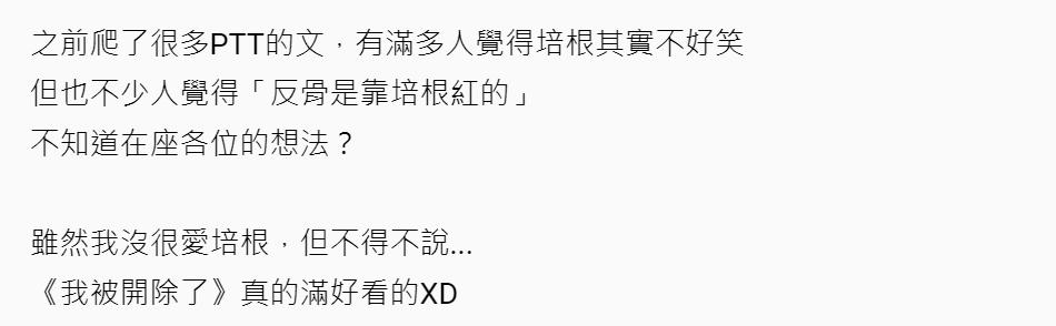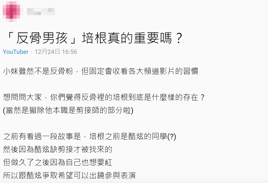 該網友日前在Dcard發文,表示自己平時經常會收看各大頻道的影片,因此對培根在反骨男孩裡的定位相當好奇,她表示自己先前看過有資料顯示「培根其實是酷炫的同學,由於酷炫缺剪輯人手因此加入團隊,隨後才逐漸從幕後轉到幕前」,原PO也透露自己上網找了許多關於培根的評價,「有滿多人覺得培根其實不好笑,但也不少人覺得『反骨是靠培根紅的』」,她也對培根的單元「我被開除了」表示大力肯定,但也因此想知道網友們的看法。