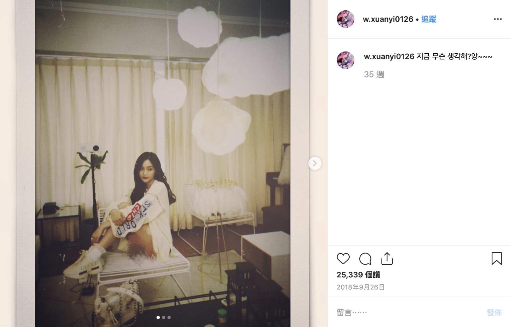 吳宣儀在23號時曬出一組美照,畫面中她身穿一件黑色的上衣,胸上的區域開了一個深V的洞,腰部的地方也充滿設計感,讓吳宣儀纖細的腰部曲線相當顯眼,下半身則是搭配了一件黑色的緊身長褲,一身黑的造型相當帥氣又不失性感。然而就有眼尖的網友發現吳宣儀胸口的地方有被縫起來的痕跡,僅露出微微的溝而已,對此網友們也紛紛猜測是因為原本的服裝胸前開的區域太多,才會將它縫起來,更有網友直呼:「應該把全部縫起來」。