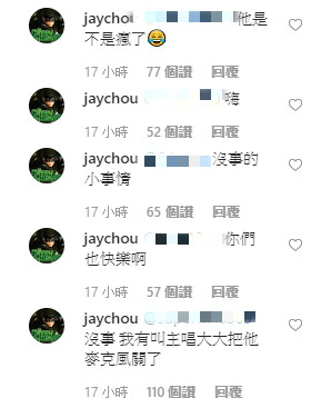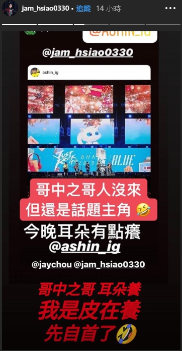 周杰倫如此幽默的應對蕭敬騰的言論,引起網友們熱烈關注與討論,後來阿信也在限動發文說,「哥中之哥人沒來,依然還是話題主角!」周杰倫便回應,「今晚耳朵有點癢~」,讓蕭敬騰見狀哭笑不得的發文說,「我是皮在養,先自首了!」