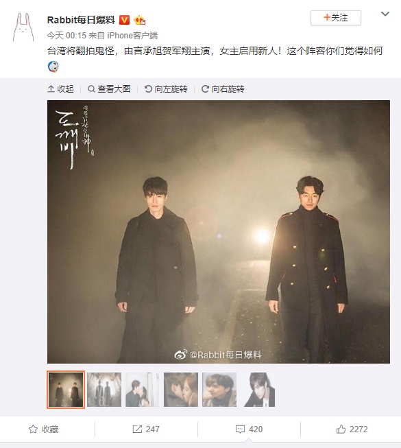 最近在微博上有多個發文爆料皆指出,「台灣將2020年翻拍《鬼怪》,演員將由言承旭、賀軍翔主演,女主角則是會挑選新人!」雖然目前無從得知這件事情到底是不是真的,但言承旭跟賀軍翔過去確實也拍過不少台灣偶像劇,也都有飾演過男主角,加上他們的顏值也都很高,讓網友們都非常興奮!