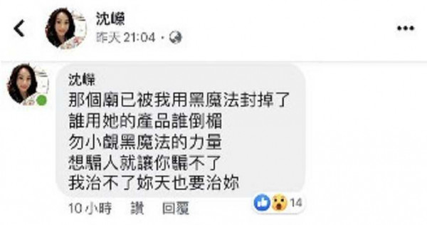 後來事情還沒結束,沈嶸還在網路上對外宣稱,「用來加持商品的廟,已經被她用黑魔法封住了!」,並且威脅旗下學員,「誰用她的產品誰倒楣,勿小覷黑魔法的力量!」還嗆聲,「想騙人就讓你騙不了,我治不了你天也要治你!」不過,對於黃女這一系列的指控,沈嶸經紀人則表示,「不實指控,老師不予回應,會繼續保持正能量來祝福大家的。」讓眾人看了都傻眼,完全無法理解「黑魔法」到底是在演哪一齣?