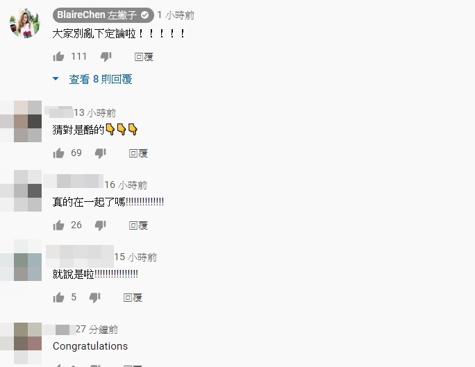 然而影片尚未播出前,便有不少網友紛紛留言表示,「Omg!!!真的是酷!恭喜你們」、「真的太酷了」、「哇~ 恭喜blaire」對此,Blaire則提早現身回復「大家別亂下定論啦」!不過影片播出後,其中滿滿的灑糖畫面,也讓更多人敲碗期待兩人能在一起!